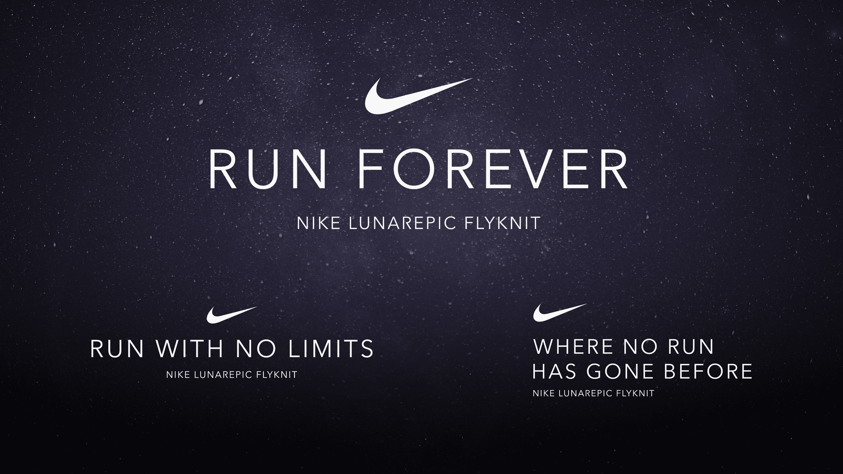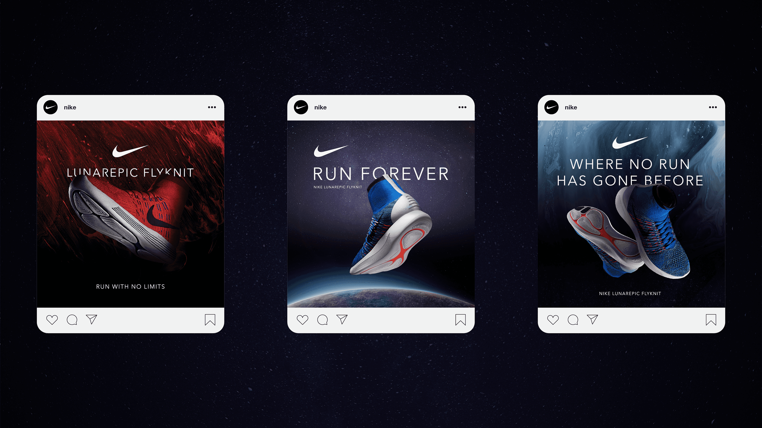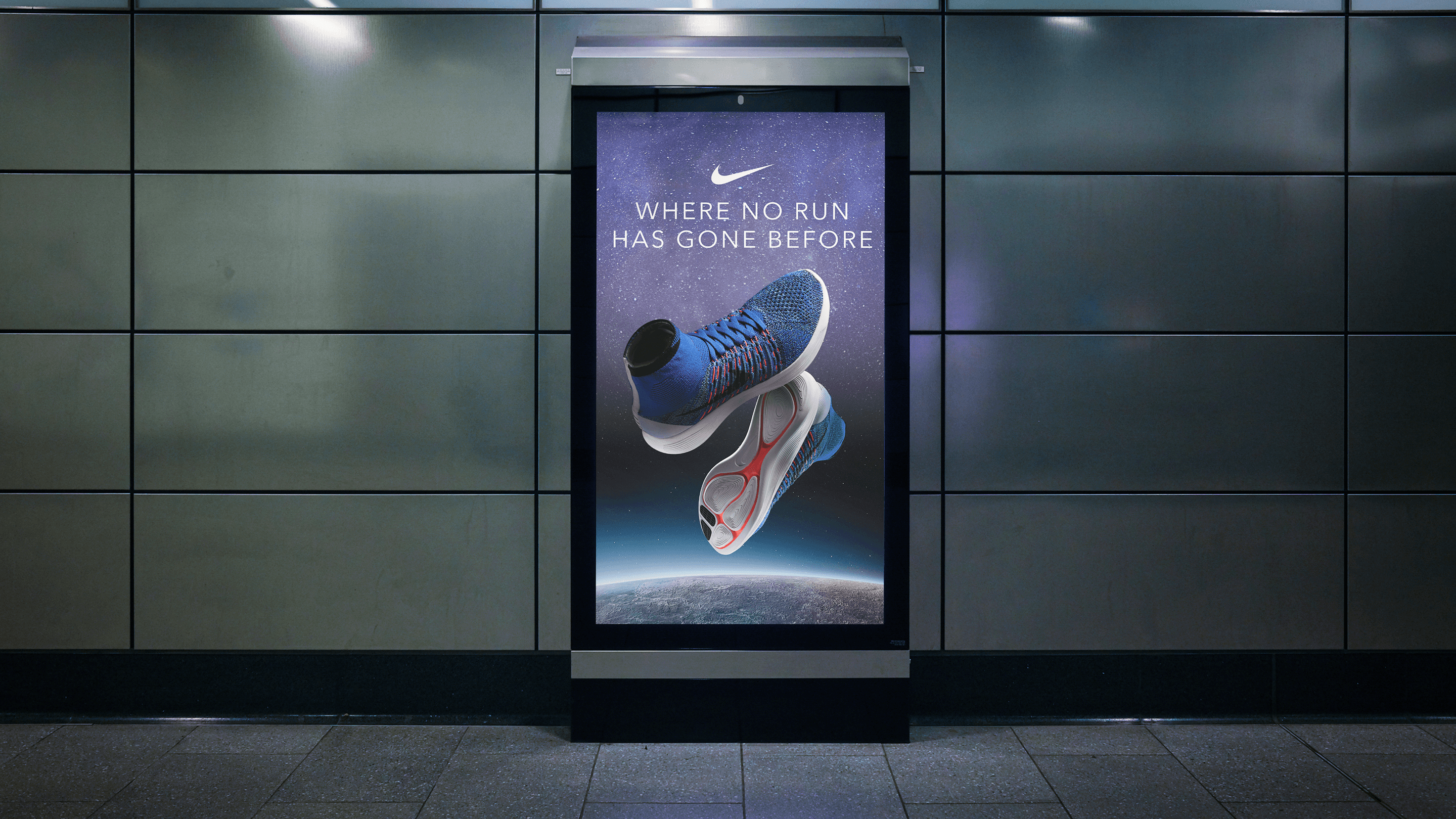 Typography was vertically stretched, haloed in glow, or contrasted against deep-space black. Color stories focused on navies, ash, and infrared—anchored in Nike’s performance palette, but shifted toward the ethereal.