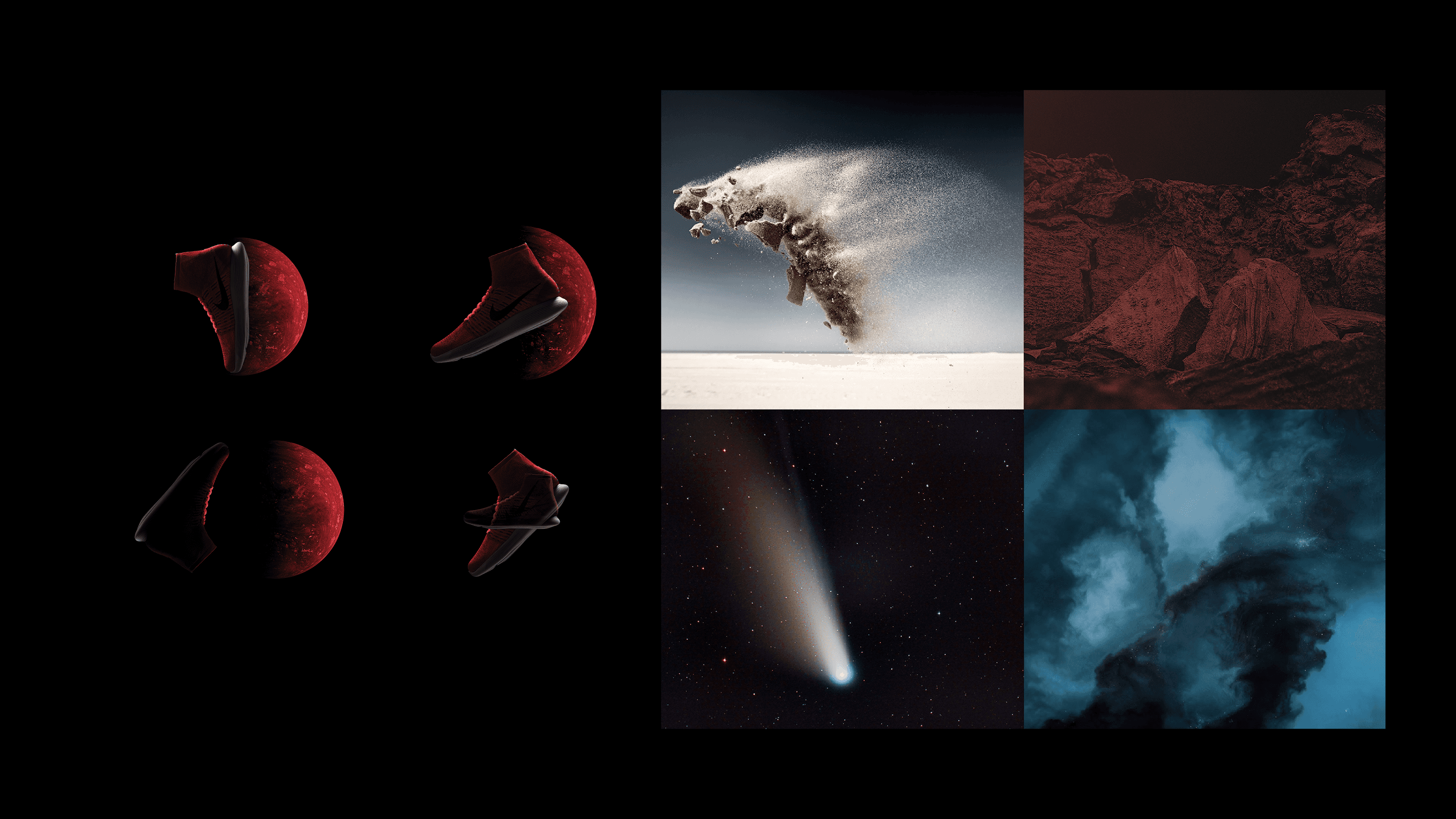We explored a visual language that felt atmospheric, abstract, and elevated. Concepts referenced orbital rings, lunar surface textures, and thermal gradients. Imagery imagined the shoe as if it had just landed—part gear, part artifact.